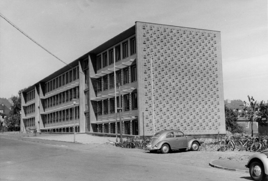 Der fertiggestellte erste Bauabschnitt der neuen Wilhelmschule, aufgenommen am 15.6.1959