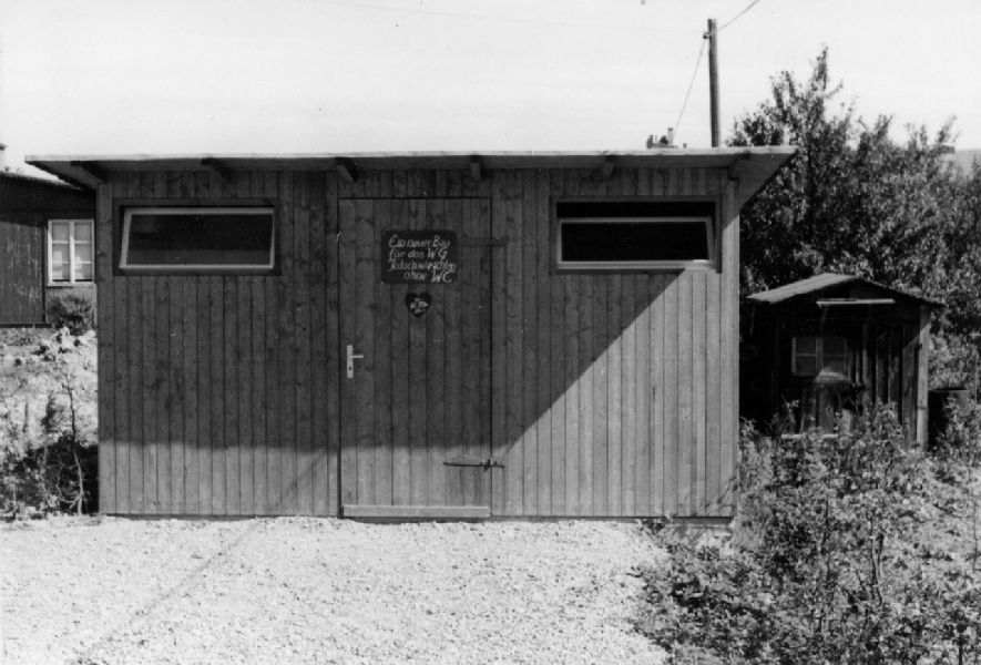 Da die Toiletten noch nicht im ersten Bauabschnitt enthalten waren, wurde ein separates Häuschen aufgestellt. Die Schrift auf der Tür lautet: “Ein neues Haus für das WG, jedoch wie schlau, ohne WC.”